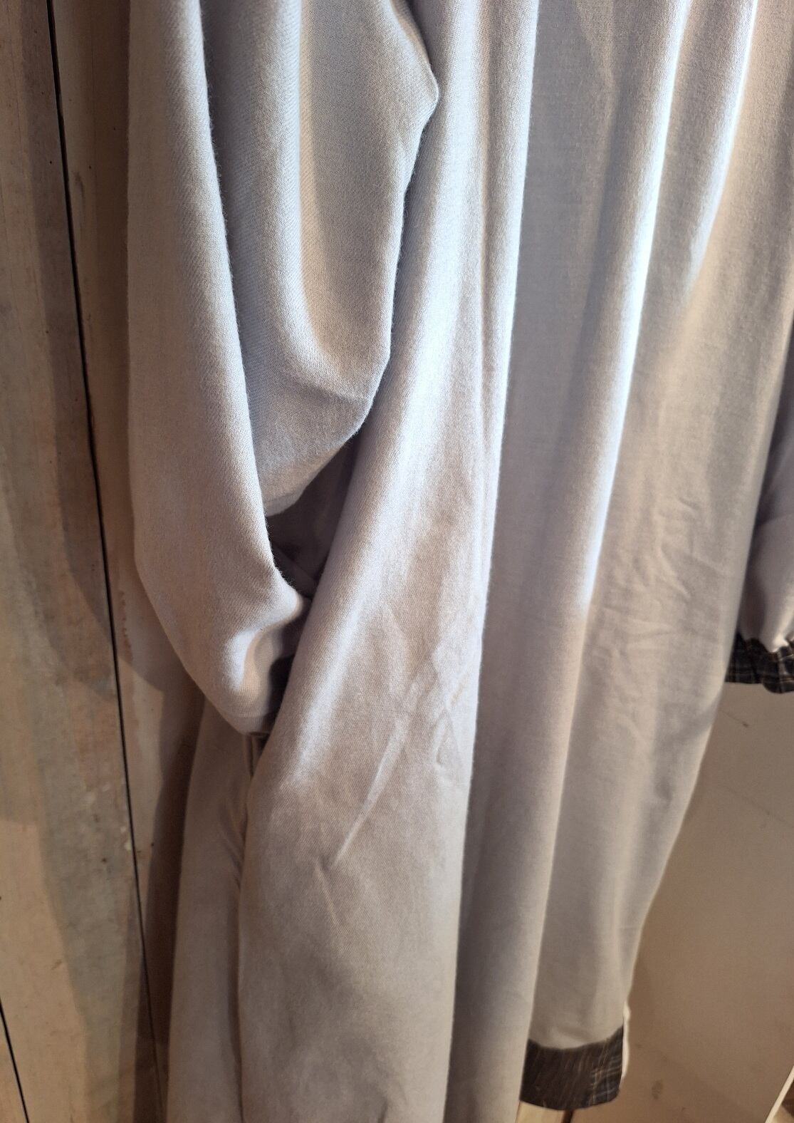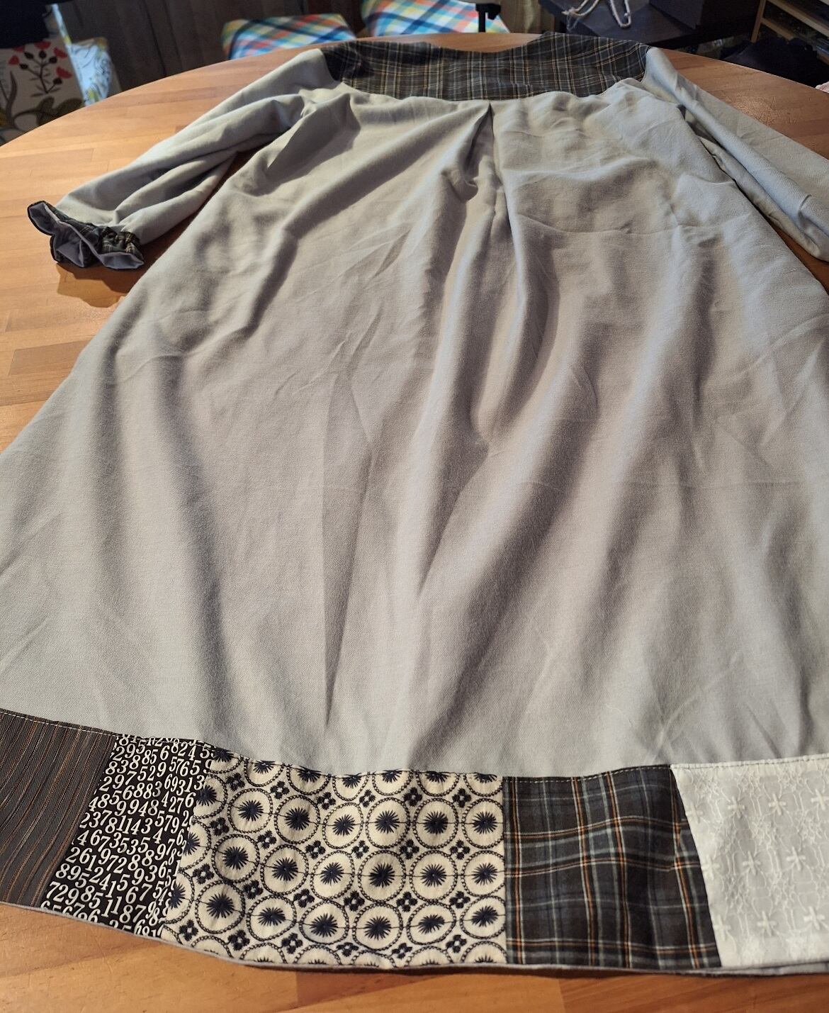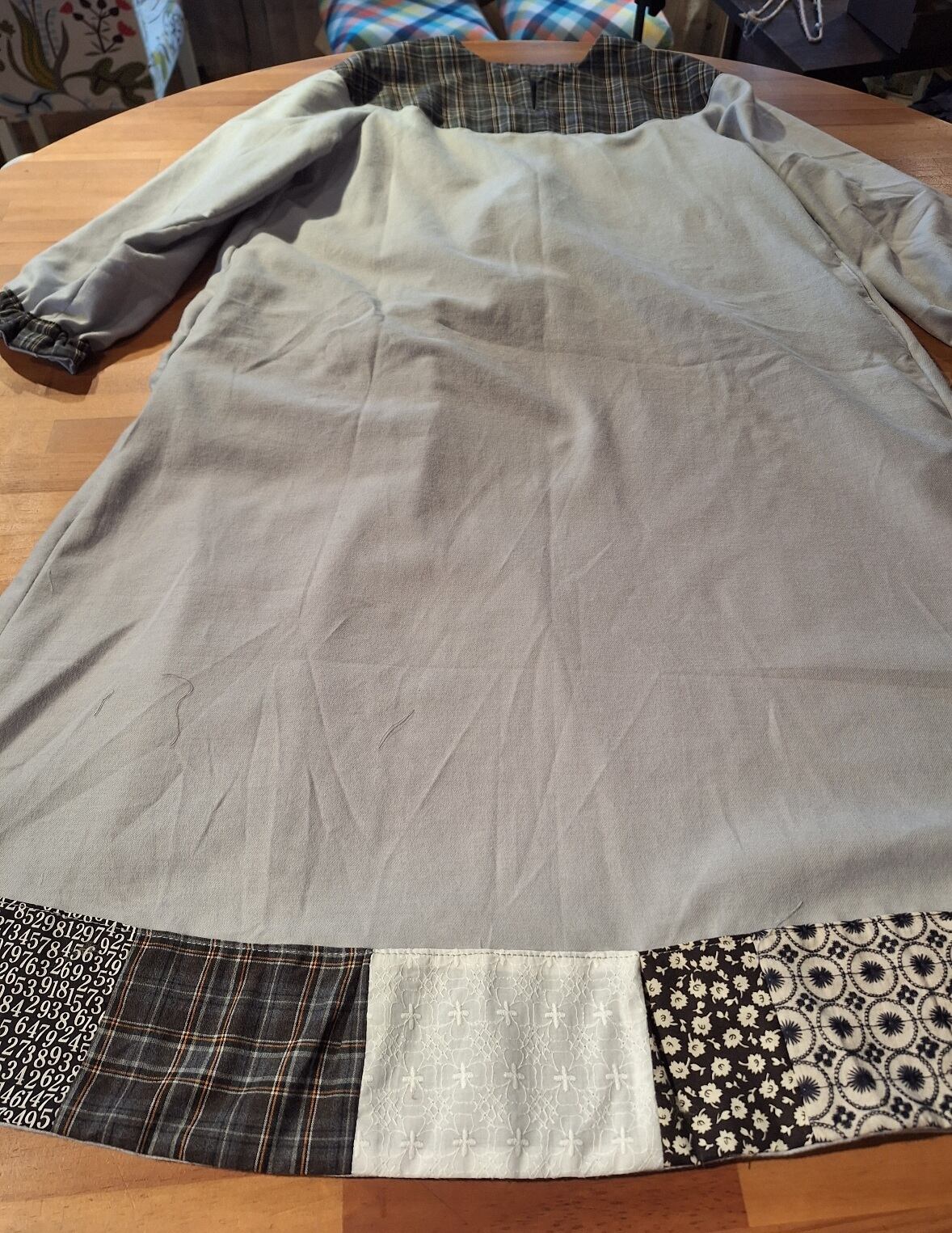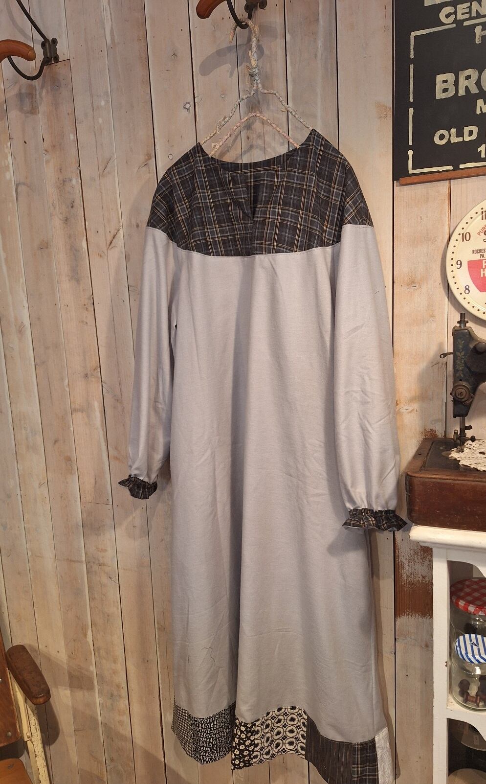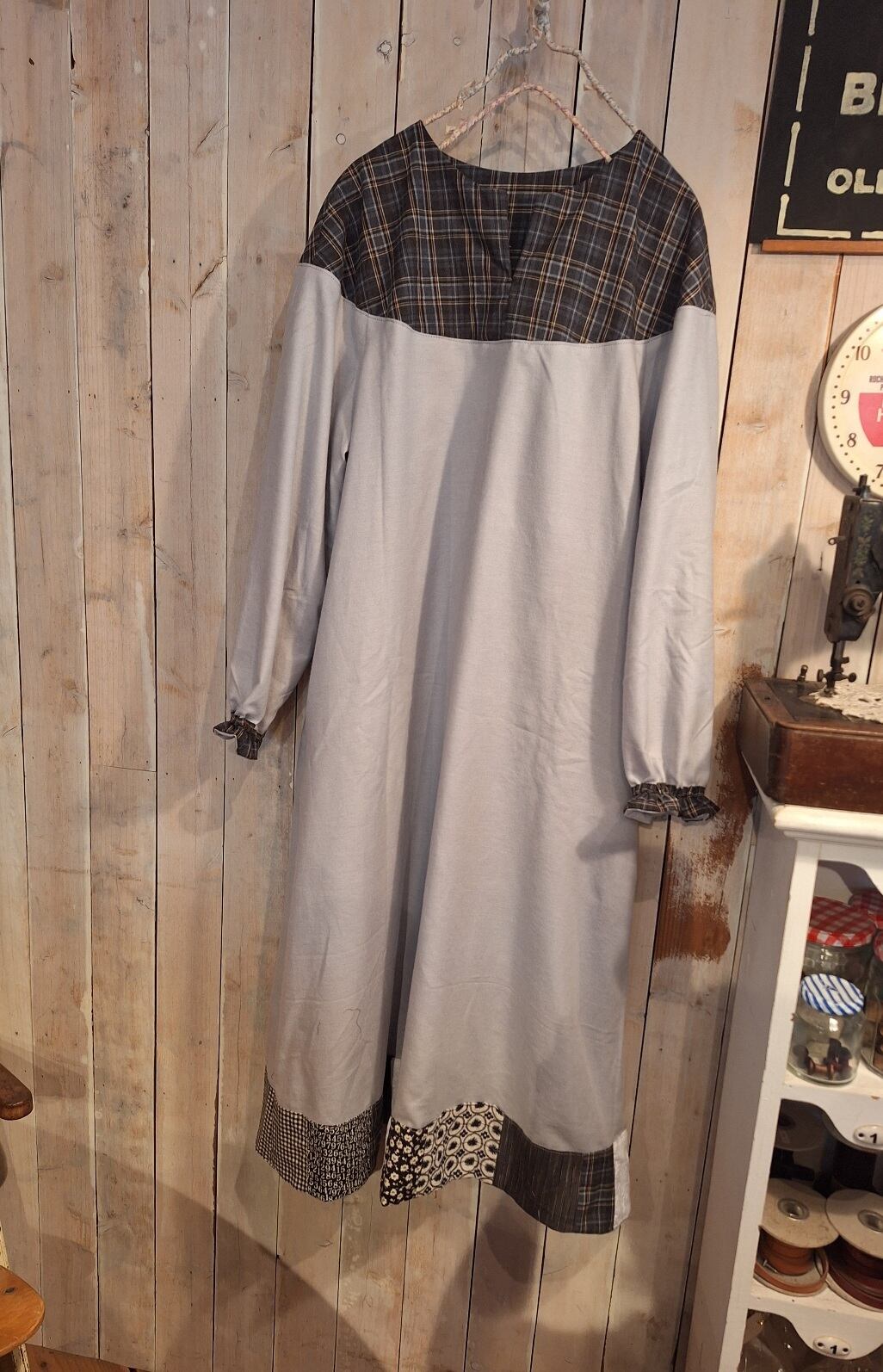 ラウンドヨークのワンピース…グレーは、起毛コットンを使用したまるヨーク切り替えの魅力的なデザインが特徴です!裾には独自のパッチワークが施されており、他にはない一点物のアイテムとなっています。ラグラン袖により、動きやすさと共に着心地も非常に良好です。