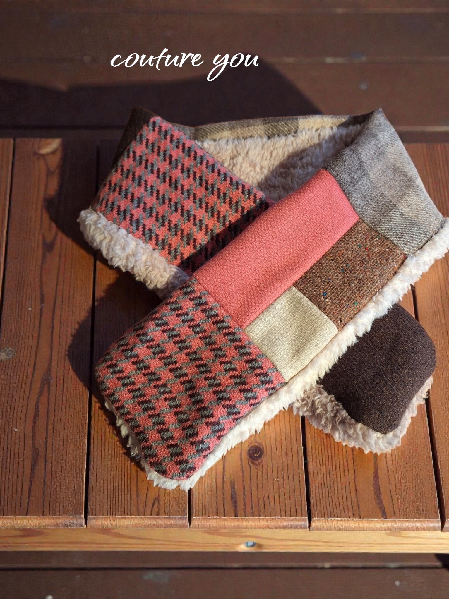 あったかパッチのショートマフラー…ピンクは、7種類のウール生地を繋ぎ合わせて作られた魅力的なアイテムです!裏側にはふんわりとしたファー生地を使用しており、肌触りが抜群で、肌寒い冬の日でも温かさをしっかりと感じられます。軽やかなサイズ感が特徴で、リラックスタイムや外出時にも心地よく身に着けられるでしょう。
