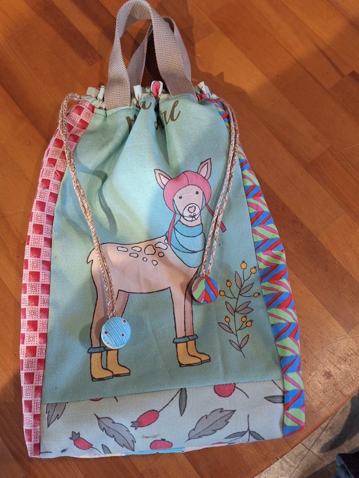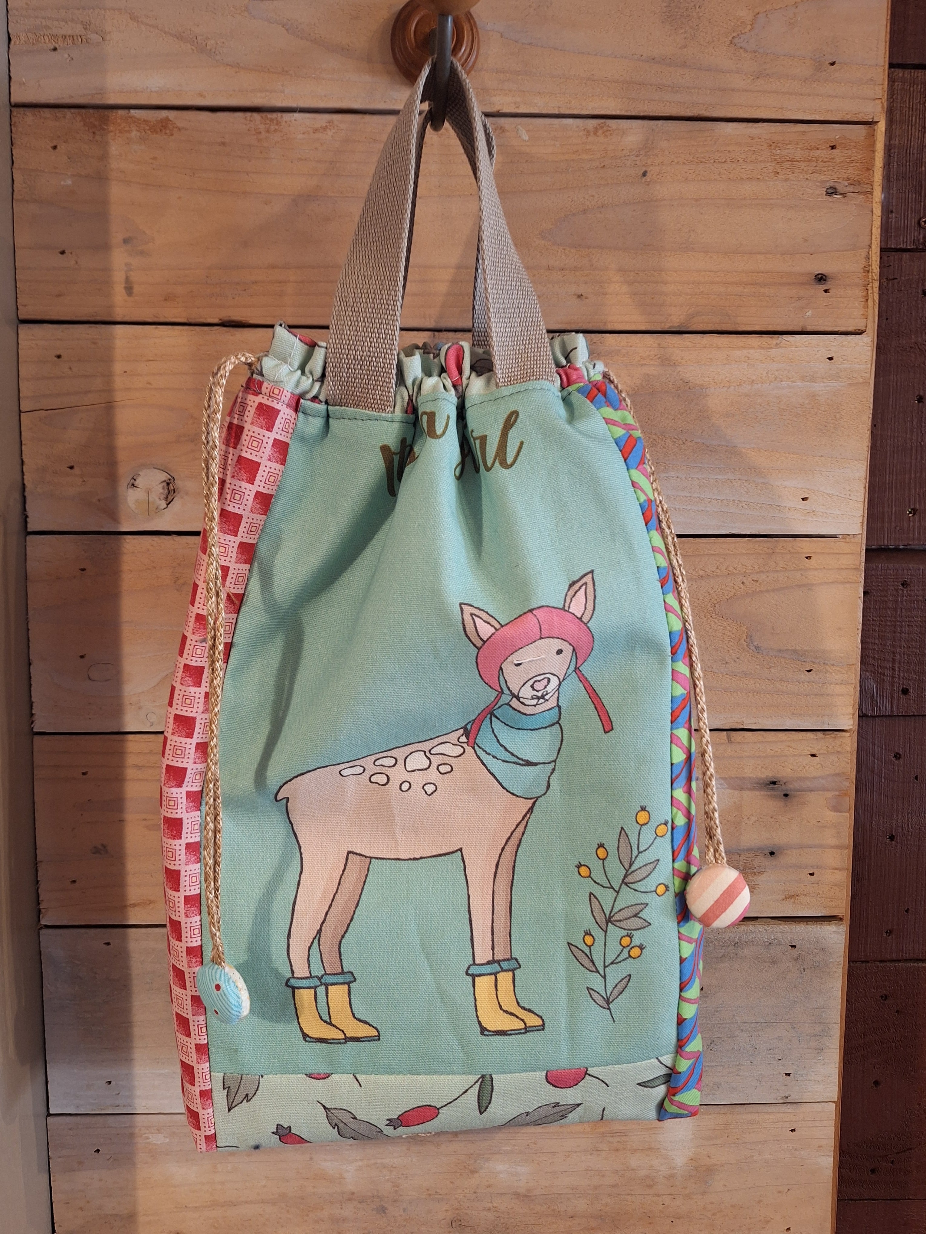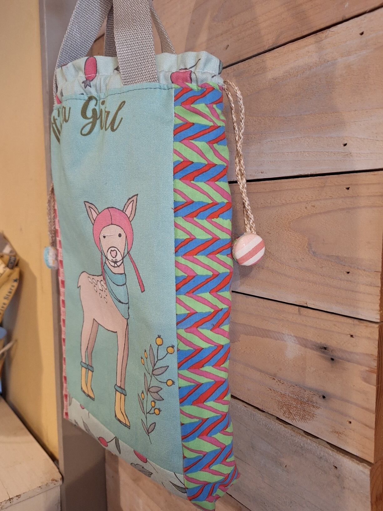 巾着バック…ターコイズは、可愛い動物モチーフを生かして作られた魅力的なアイテムです!裏側にはお洒落なパッチワーク仕立てが施されており、ユニークなデザインが目を引きます。内布にはしっかりとした厚みのあるコットン生地を使用しており、安心してお使いいただけます。サブバッグとしてや上履き入れなど、様々なシーンで大活躍すること間違いなしです!