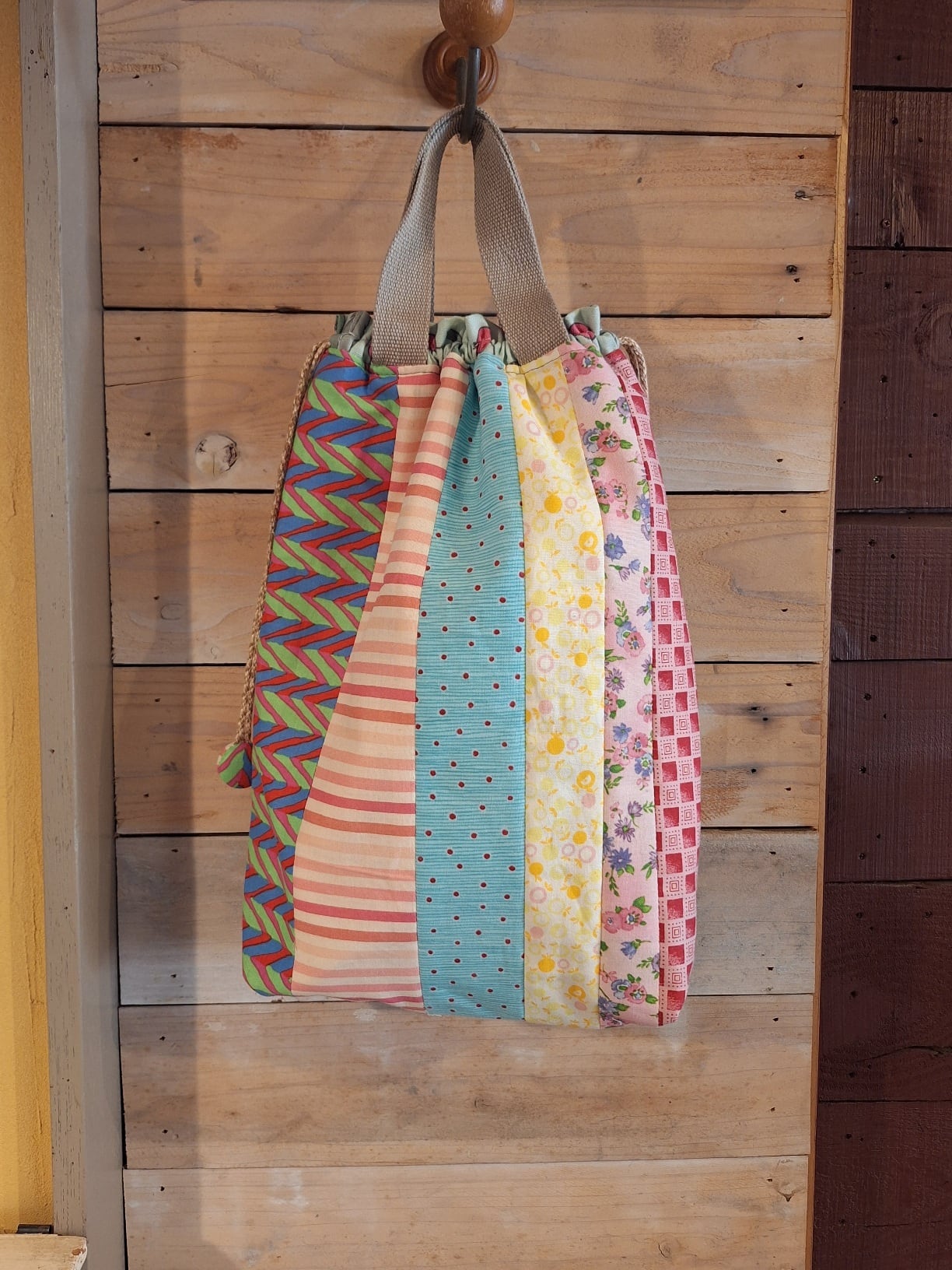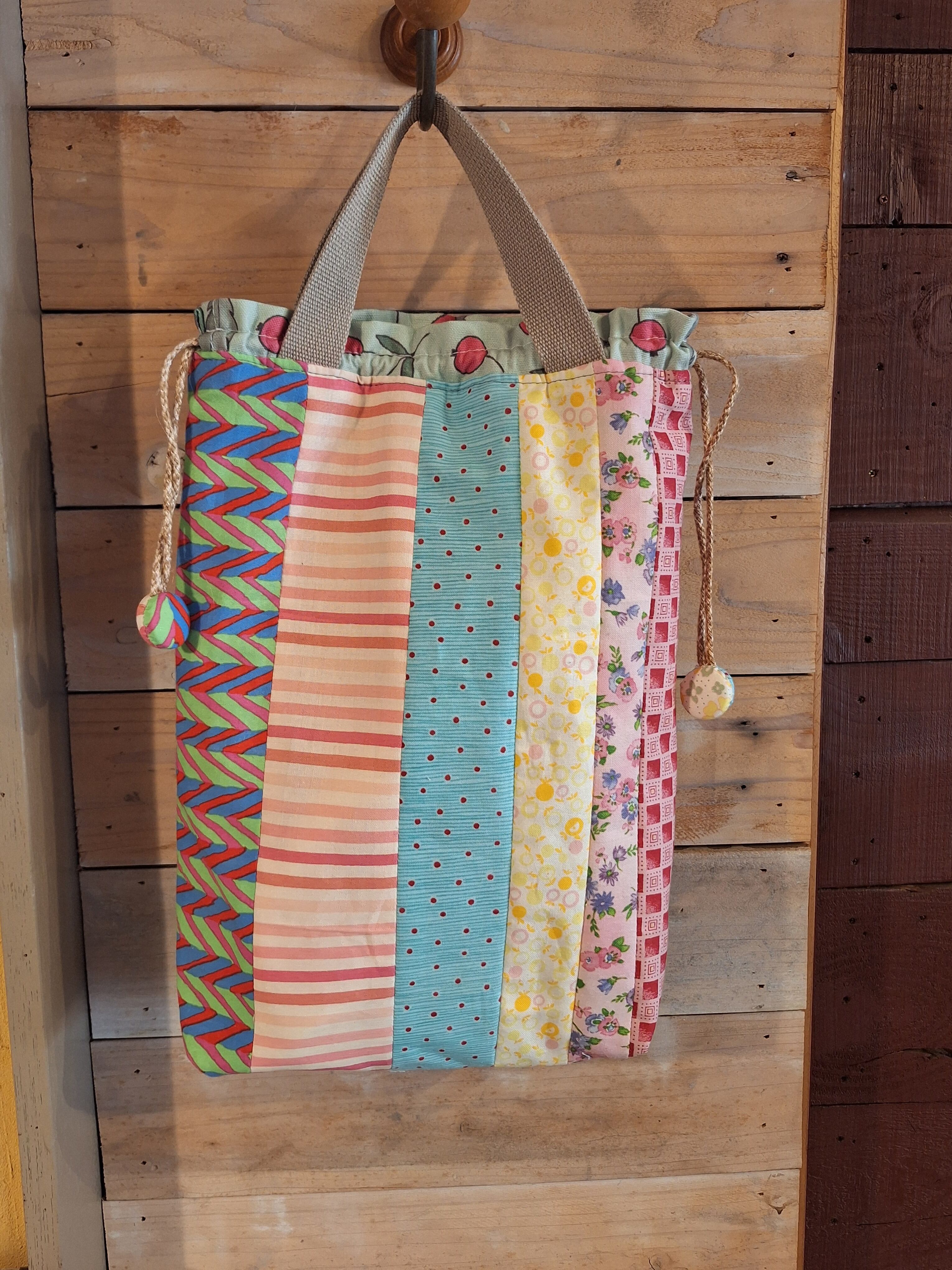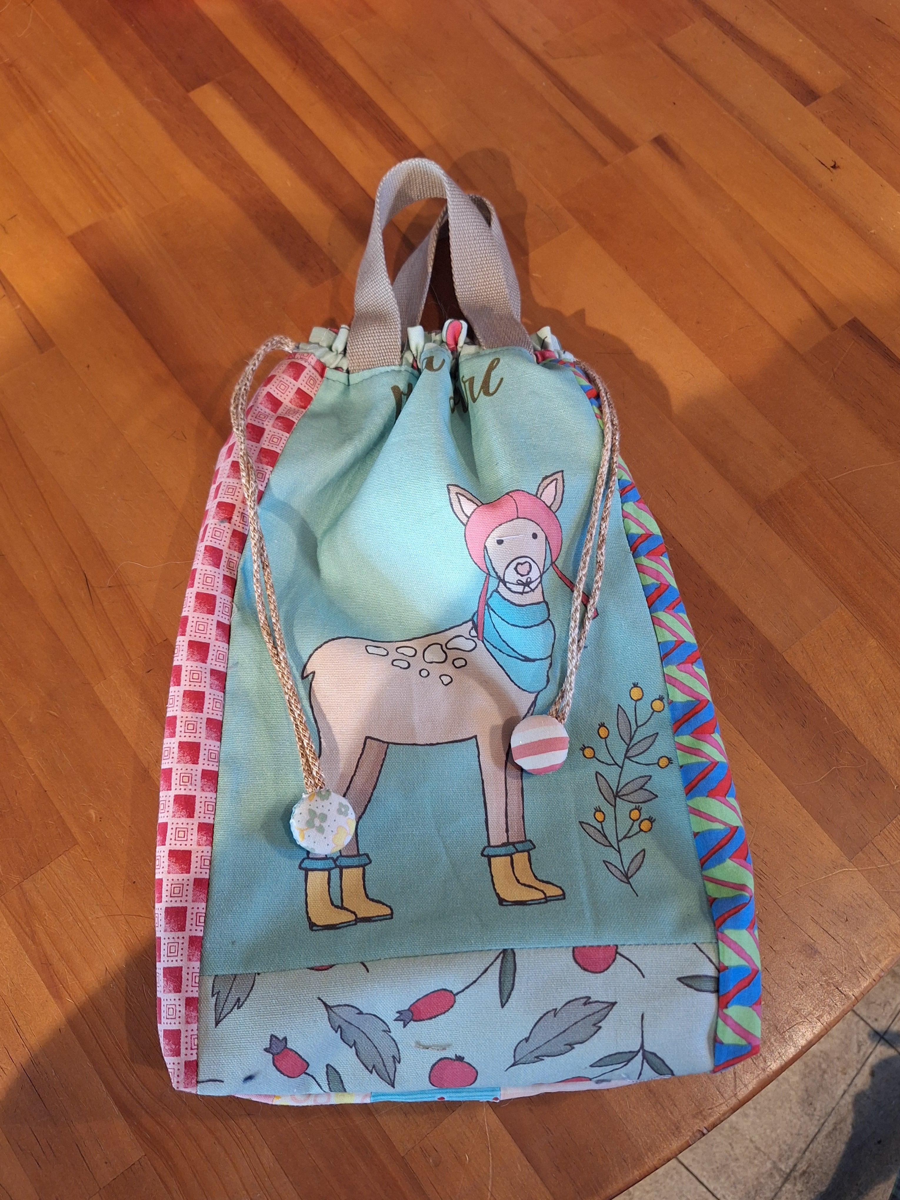 巾着バック…ターコイズは、可愛い動物モチーフを生かして作られた魅力的なアイテムです!裏側にはお洒落なパッチワーク仕立てが施されており、ユニークなデザインが目を引きます。内布にはしっかりとした厚みのあるコットン生地を使用しており、安心してお使いいただけます。サブバッグとしてや上履き入れなど、様々なシーンで大活躍すること間違いなしです!