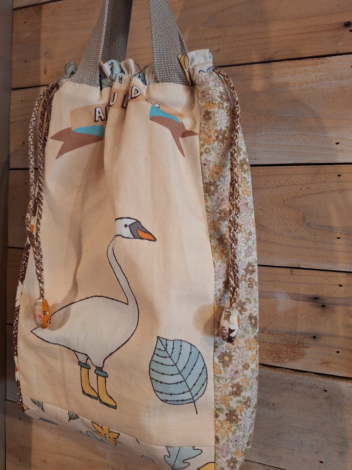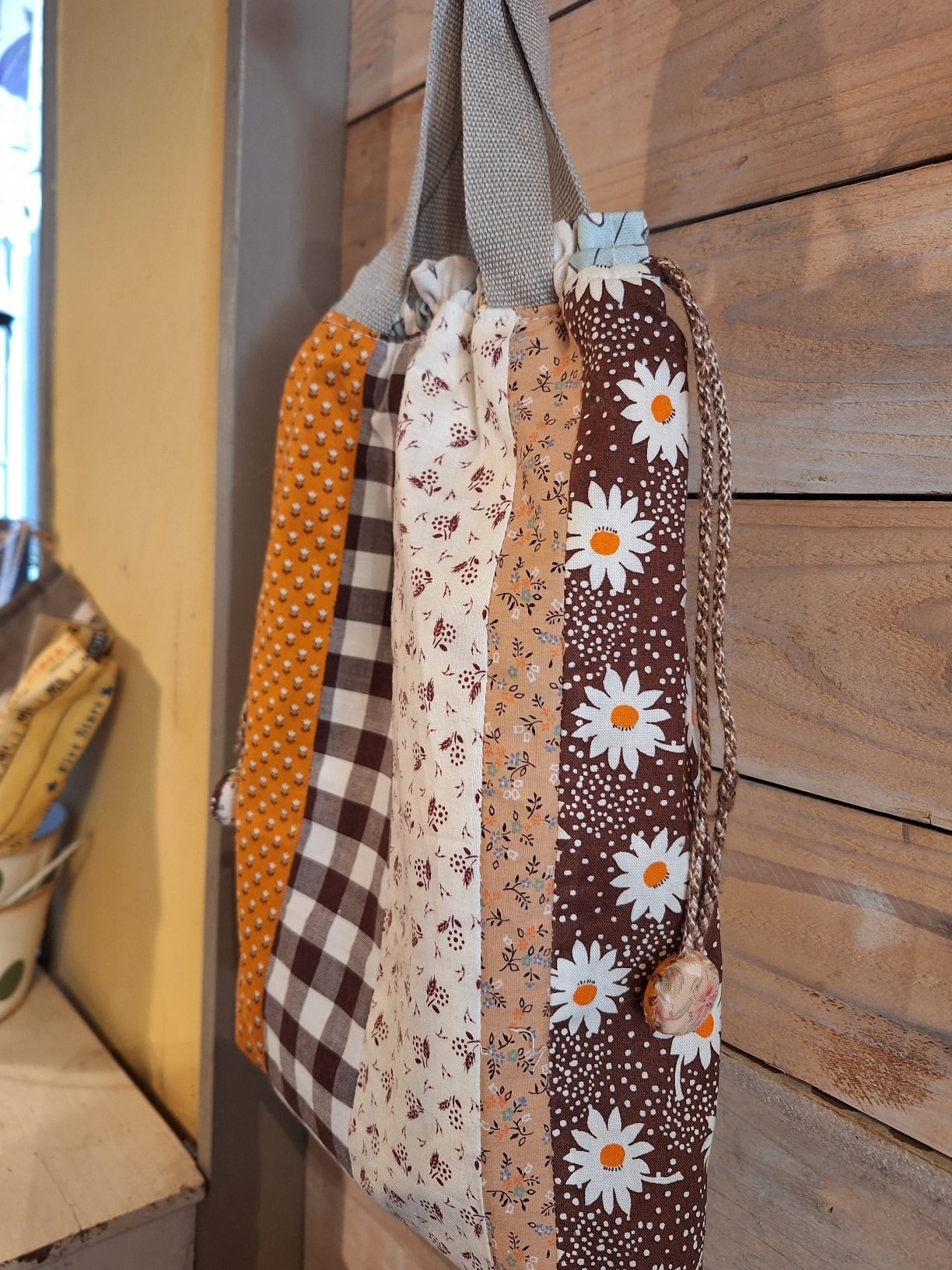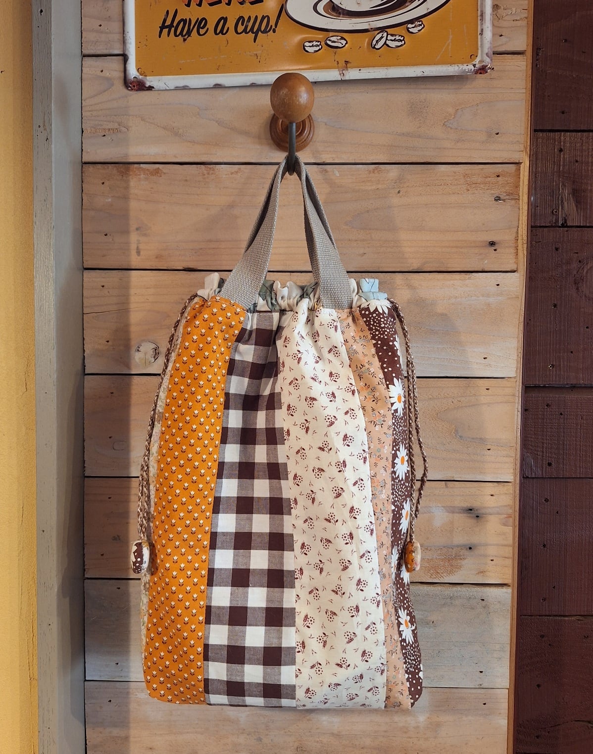 巾着バック…ベージュは、可愛い動物モチーフのパネル柄を生かして作られた魅力的なアイテムです!裏側には6種類のコットン生地を繋ぎ合わせたユニークなデザインが施されており、お洒落な印象を与えます。内布には厚手のしっかりしたコットン生地を使用しており、安心してご使用いただけます。サブバッグや上履き入れとして、様々なシーンで大変重宝します!