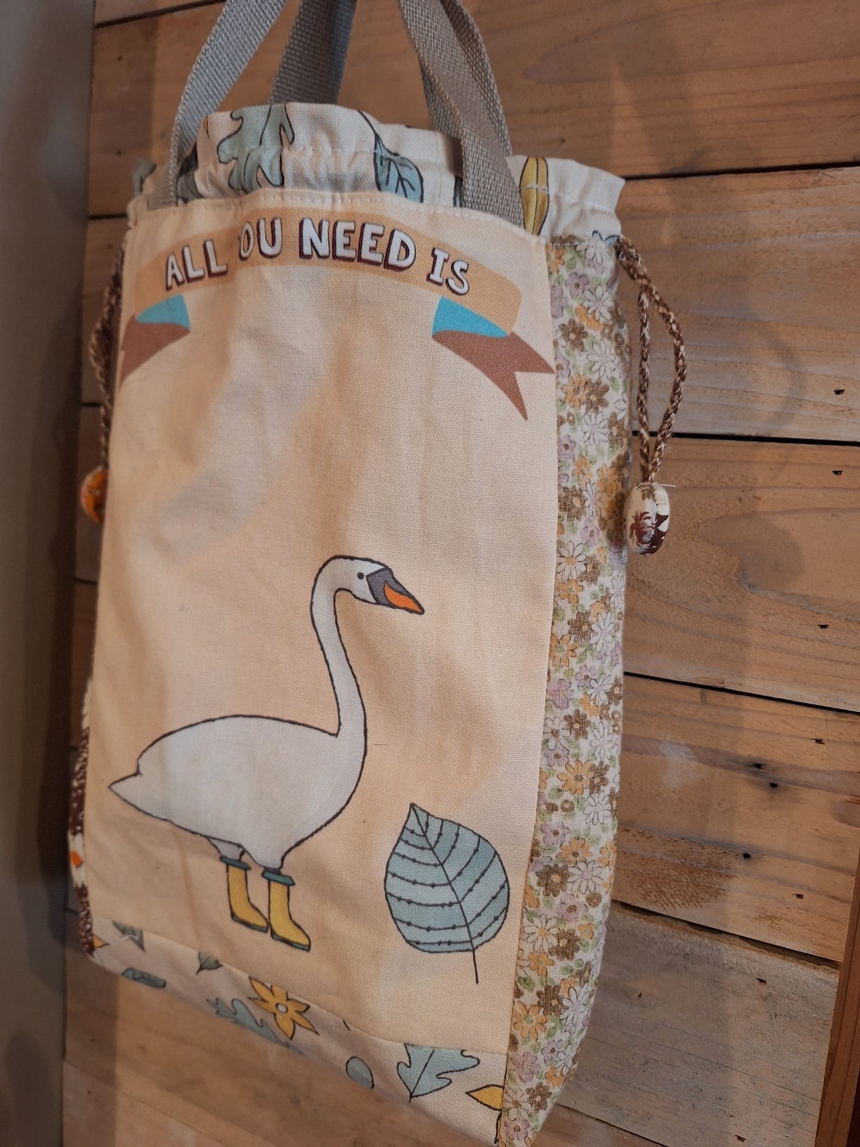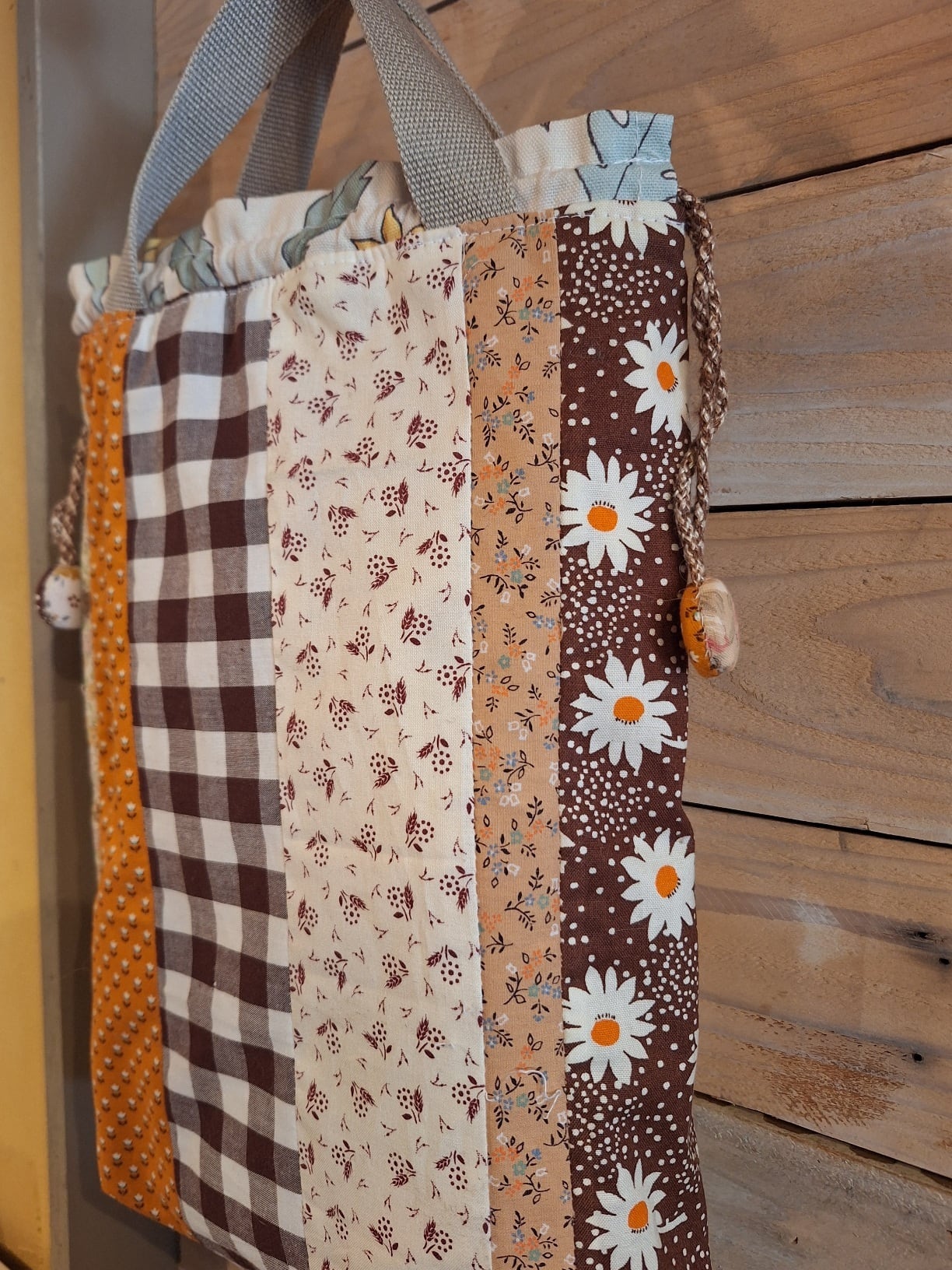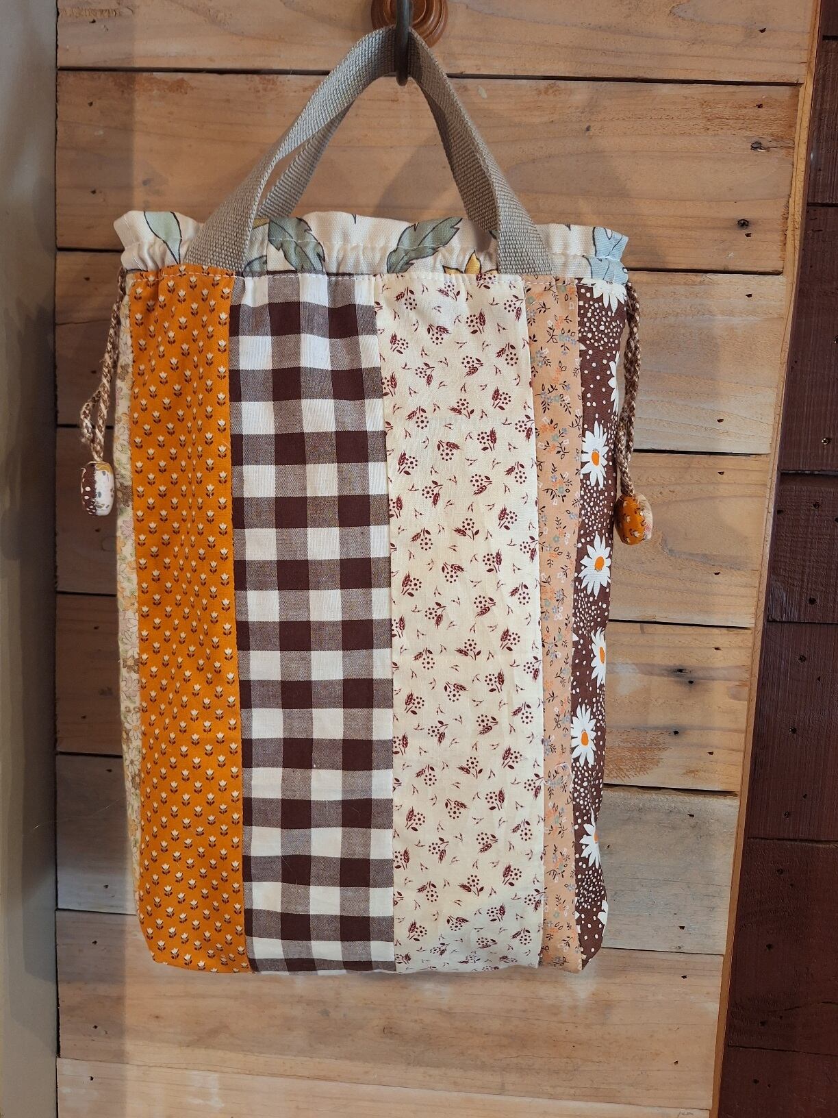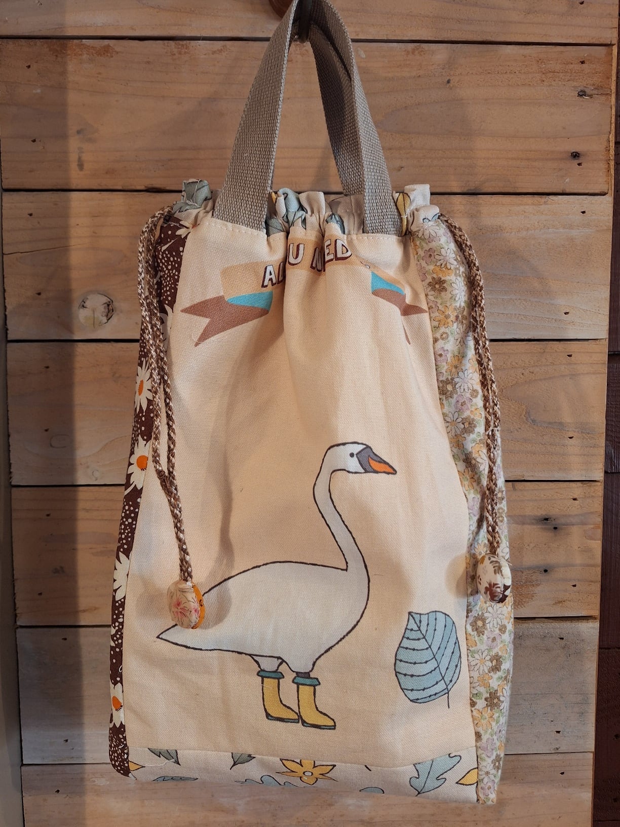 巾着バック…ベージュは、可愛い動物モチーフのパネル柄を生かして作られた魅力的なアイテムです!裏側には6種類のコットン生地を繋ぎ合わせたユニークなデザインが施されており、お洒落な印象を与えます。内布には厚手のしっかりしたコットン生地を使用しており、安心してご使用いただけます。サブバッグや上履き入れとして、様々なシーンで大変重宝します!