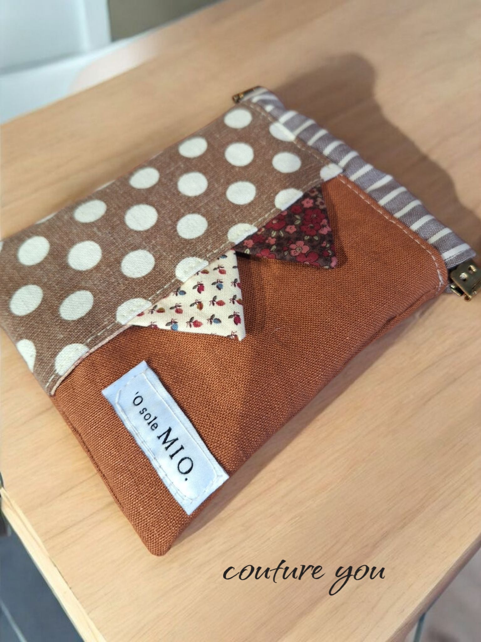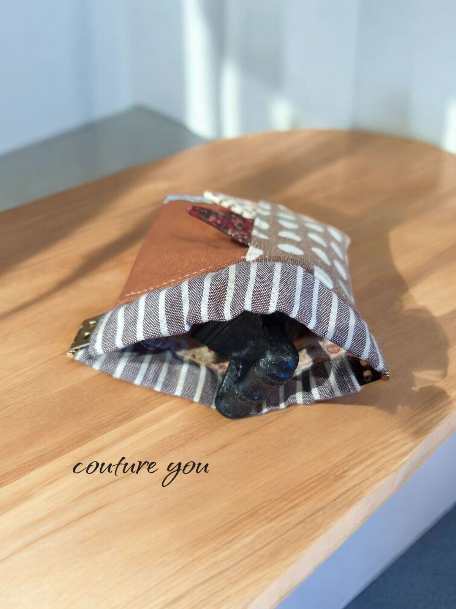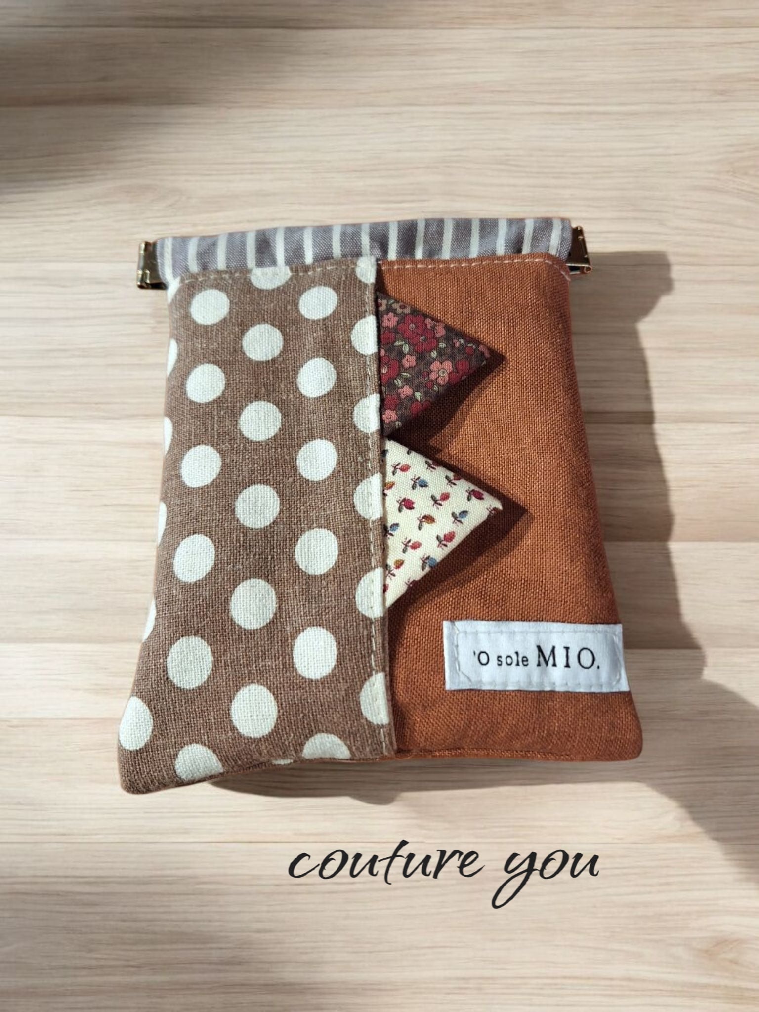 バネ口ポケティポーチ…茶は、リネン生地とコットンリネン生地を使用して作られた、多機能でお洒落なアイテムです!ティッシュケースとバネ口ポーチが一体になっており、デザインだけでなく実用性も兼ね備えています。ティッシュケースの出し入れ口には、ほんのりとしたアクセントの三角フラッグが付いており、可愛らしさを引き立てます。