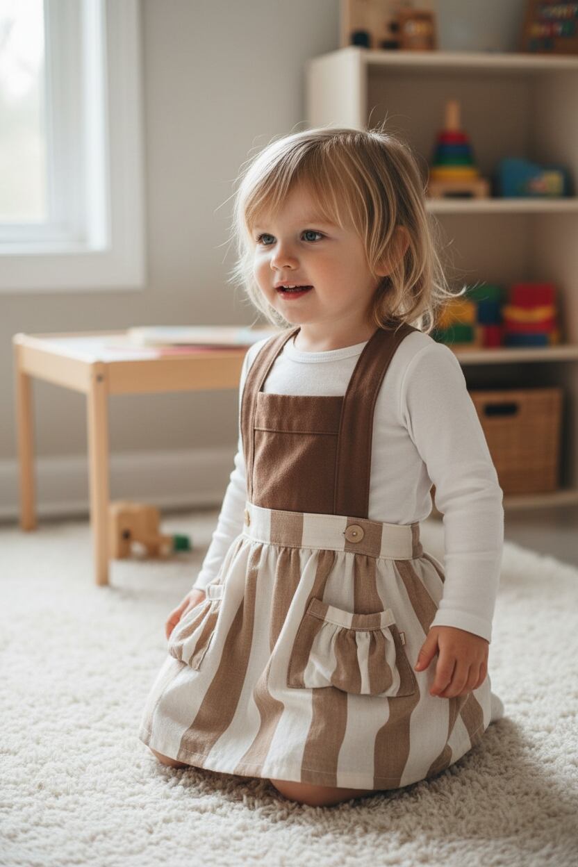 おしゃれで使い勝手の良いエプロンスカート(茶ストライプ)をぜひお試しください!心地よい暮らしを彩る一着。女の子のかわいさをより一層引き立ててくれます。