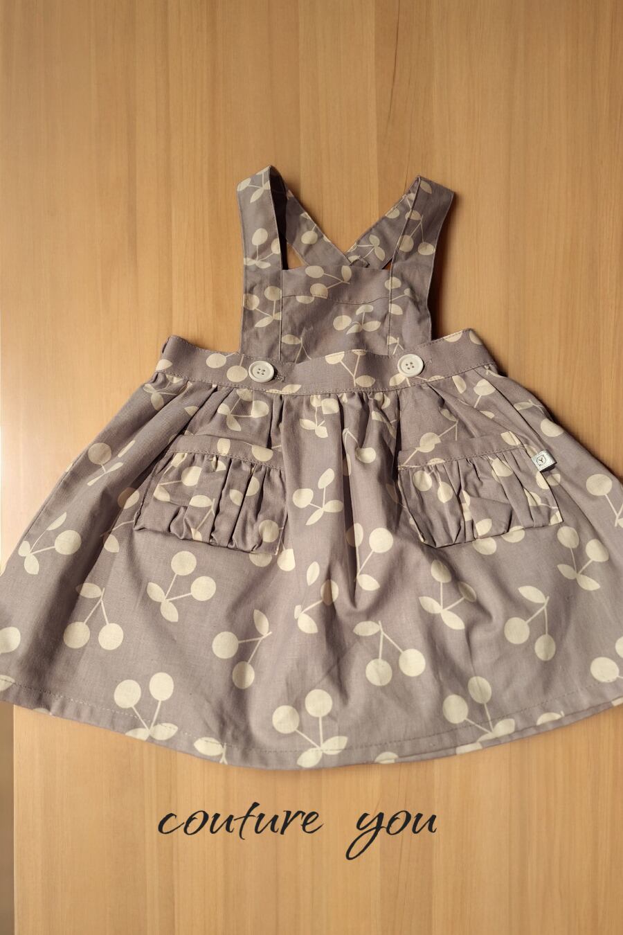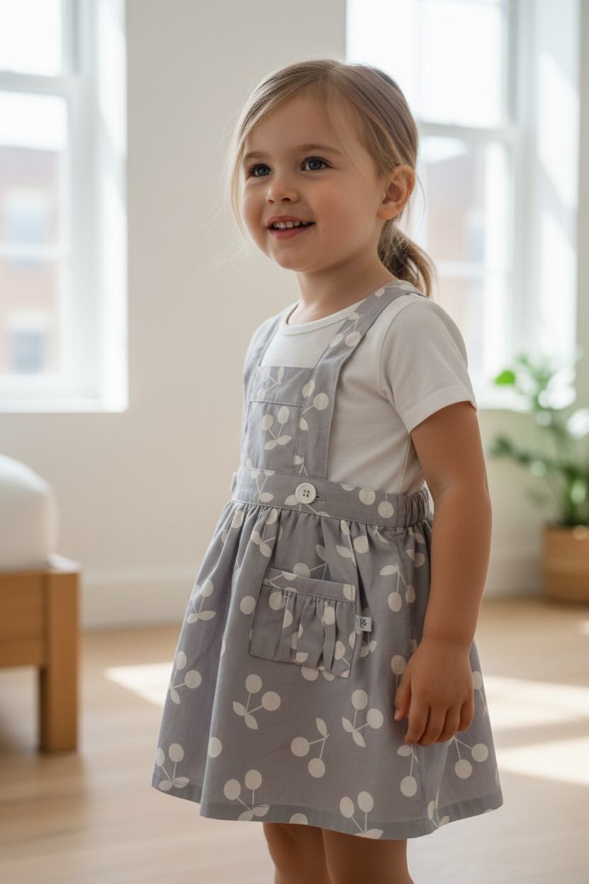 胸元にチェリーがかわいく散りばめられたエプロンスカートが新登場しました。チェリーボンボン柄がおしゃれで、取り外し可能な胸当て付きなので、エプロンとして使うのはもちろん、スカートとしても着ていただけます。ボタンで長さを調節できるので、80cmから90cmの子供たちにもピッタリ。グレイのコットン生地は肌触りも良く、丈夫で長くご愛用いただけます。